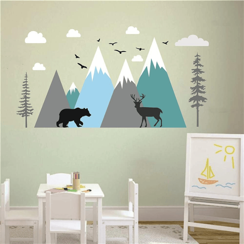 Create a magical nursery with this big mountain tree wall decal featuring deer, bear, clouds, birds, and tribal forest elements. Made from eco-friendly, non-toxic vinyl, this peel & stick mural is waterproof, removable, and safe for kids’ rooms. Perfect for baby nursery, kids’ bedrooms, or adventure-themed décor.